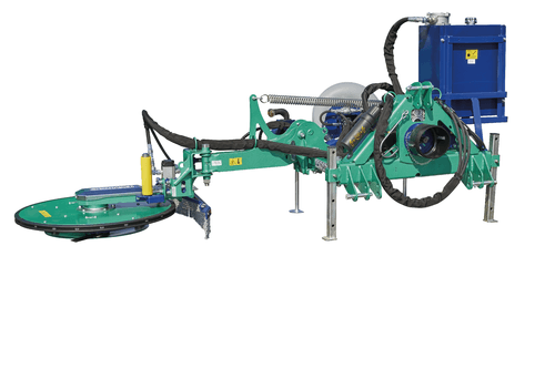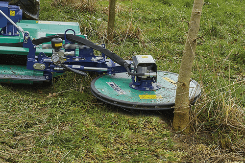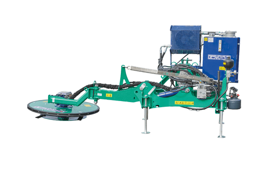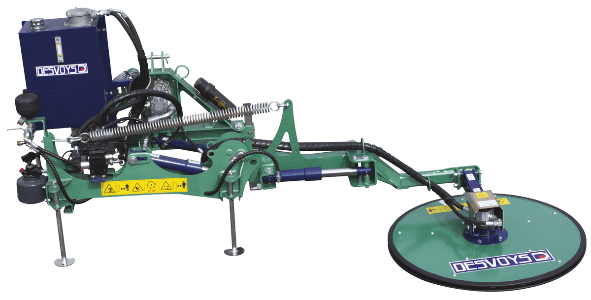 Broyage à droite : attelage 3 points arrière, 3 points avant ou chargeur. Broyage à gauche : attelage 3 points avant et télescopique. Rotor avec 3 couteaux escamotables. Couteaux 3 positions. Vitesse de rotation du rotor 1 900 tr/mn à 50 L/mn. Coupelle d'appui Ø 700 mm libre en rotation avec semelle HARDOX et inclinaison pour un meilleur suivi du sol. Effacement par vérin et boule d'azote réglable par pompe à main. Largeur de travail : 1 m. Fabriqué en France