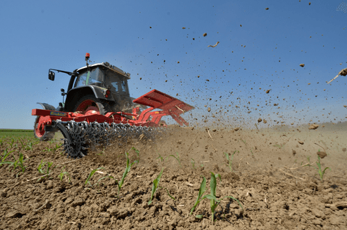 2 rangées de houes rotatives à doigts, la croûte est cassée et émiettée grâce aux pointes des étoiles en forme de cuillère.