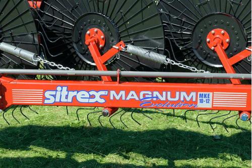 Andaineur soleils MKE Evolution AUTO-DIRECTIONNEL équipé de 12 roues soleil de 1,40 m de diamètre et avec 40 dents chacune. Avec une largeur de travail de 7,6 m et une largeur de transport de 2,55 m. La puissance minimum requise du tracteur est de 30cv. Largeur d’andain minimum 0,90 m et maximum de 1,8 m. Choix d’options.