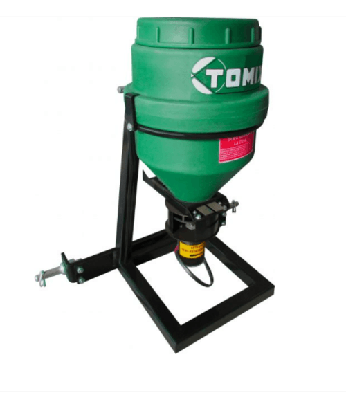 4 - Distributeur de granulé électrique DGT anti-limace et petite graines, cuve en polyéthylène haute densité de 25 litres à distribution électrique 12 V, épandage de 3 à 24 m, réglage de 0 à 300 kg / heure, graduation de 0 à 30 turbine orientable.