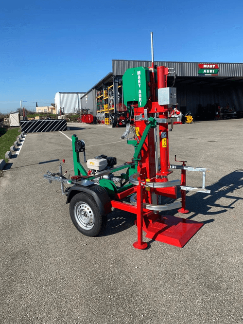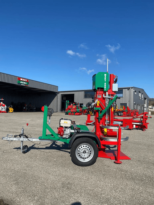 En version verticale, nous proposons une fendeuse de 14 tonnes de puissance de fendage, avec une course de vérin de 1100 mm et un passage de bûches de 1150 mm, Monté sur un châssis routier de qualité avec essieu Alko et roues 13.
