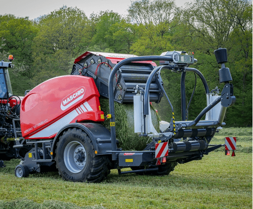 Chambre fixe à rouleaux Ø 1,20 m. Enrubanneuse à double satellite à gestion automatique. Liage filet ou film plastique avec dispositif exclusif. Lubrification et graissage automatique pour une meilleure longévité.