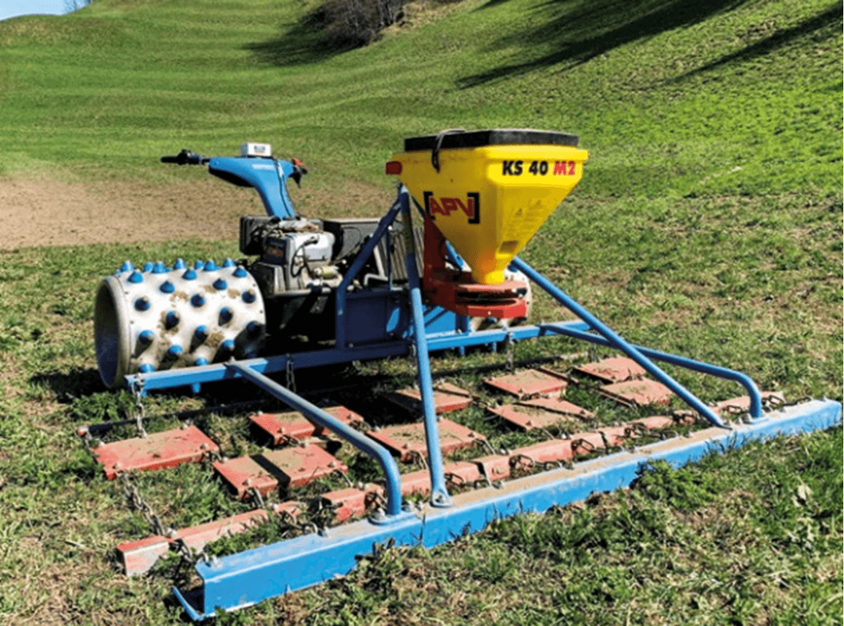 KS 40 M2 est un épandeur à disque conçu pour des petites largeurs de travail. Avec son poids faible (19 kg vide) et ses dimensions, il est polyvalent et permet la distribution de graines d’herbe, des couverts végétaux et des granulés anti-limaces... La trémie avec une capacité de 40 L distribue les produits à épandre qui sont amenés vers la vanne à l’aide d’un agitateur dont le débit se règle en continu et sont répartis uniformément sur toute la largeur de travail. Un boitier de commande permet depuis son siège conducteur de régler le régime du disque d’épandage et la largeur de travail.