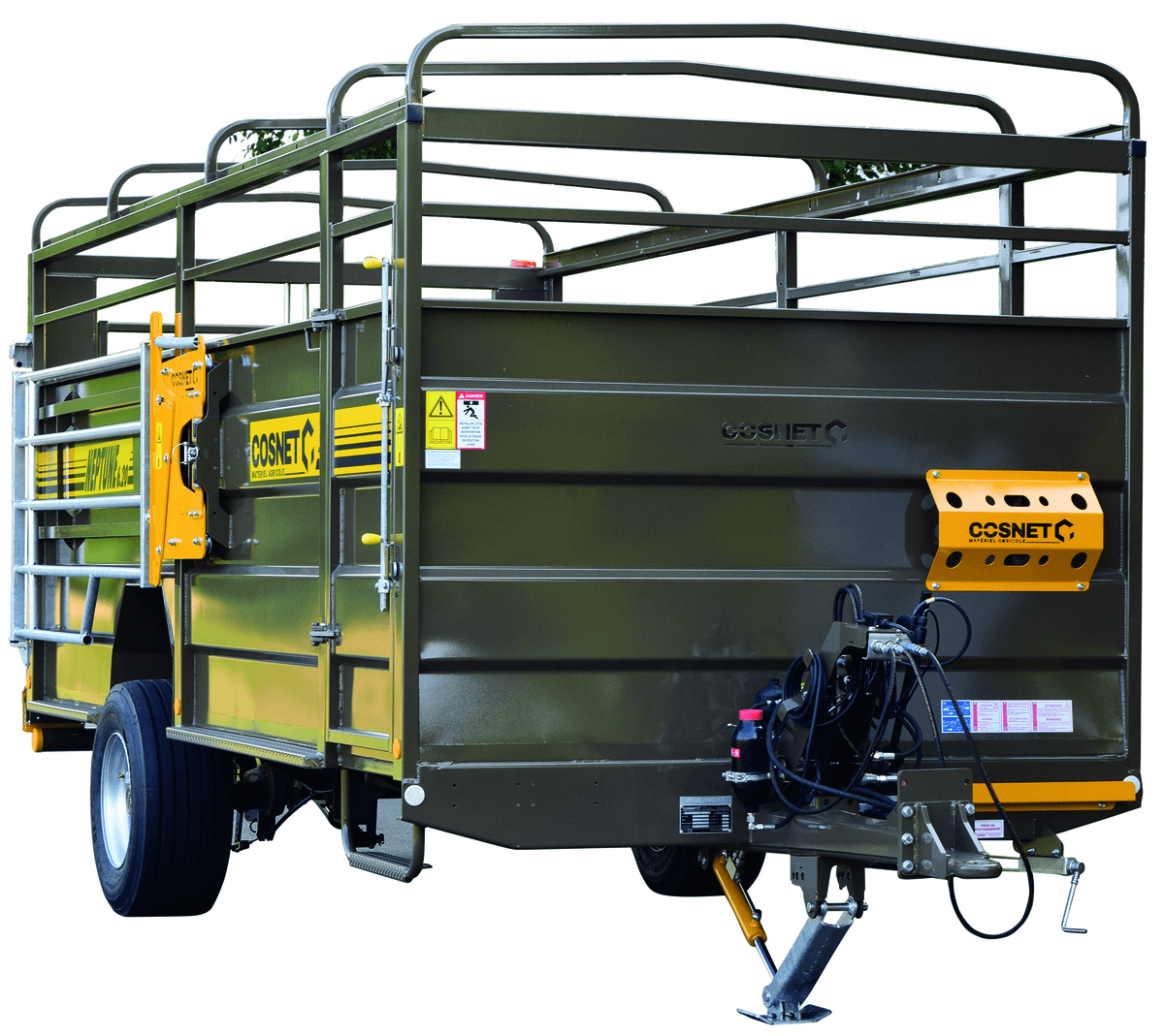 Fond tôle larmée. 8 à 10 bêtes. Freinage double ligne hydraulique. Caisse 5,10x2,40m. Pont de chargement assisté par 2 vérins à ressort. L1,50m x l2,09m. C.U 5,07T. Roues 13.0/65-18 16 Plys. Existe aussi en version double ligne pneumatique.