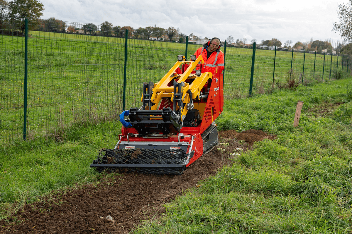 Porte outils ultra compact sur chenilles pour tous types de terrains qui assemble puissance, maniabilité et polyvalence. Pour les besoins des espaces verts, BTP etc… Bras hydraulique multifonction avec levage jusqu’à 2,10 m et capacité de 890 kg avec un vérin de cavage sur l’attache pour plus de précision et de polyvalence et qui peut recevoir une large gamme d’accessoires pareils qu’un lamier pour la taille, un godet, un enfonce pieux, une fourche à palette, une balayeuse, broyeur etc…