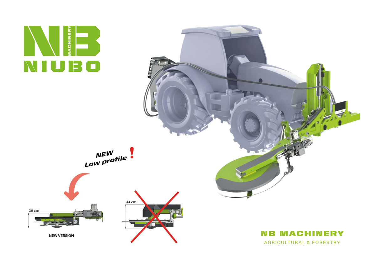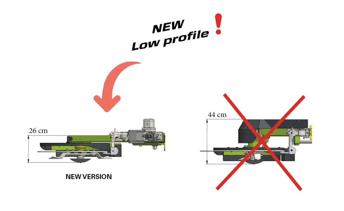 Disques de 800mm avec couteaux ou fils nylon, sur châssis renforcé avec extension hydraulique jusqu’à 3.20m du centre du tracteur, attelage avant ou arrière, palpeur hydraulique avec réglage de sensibilité, roue de control.