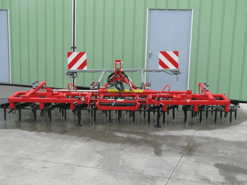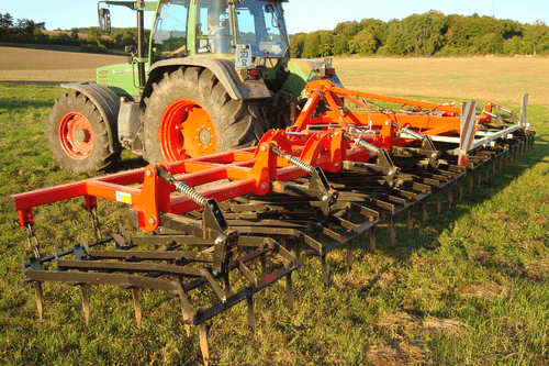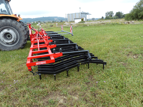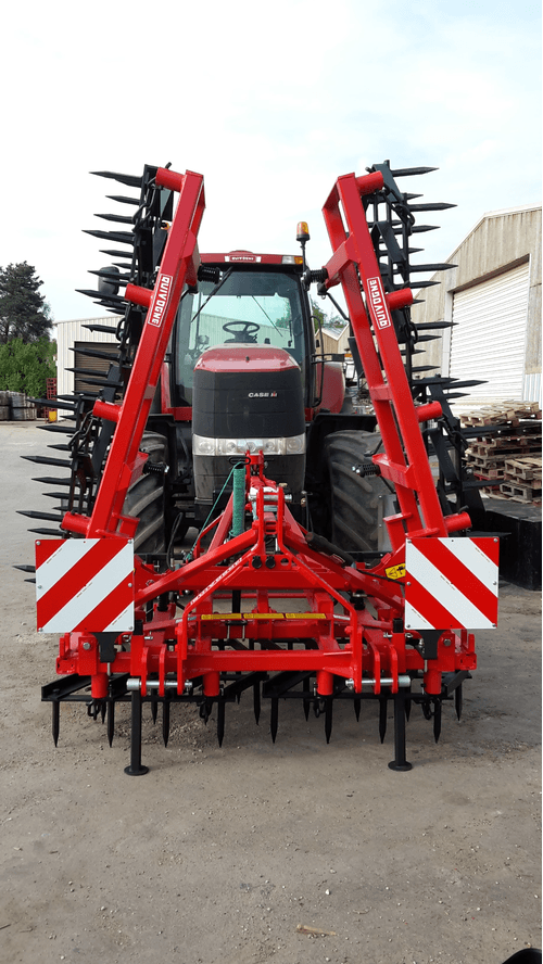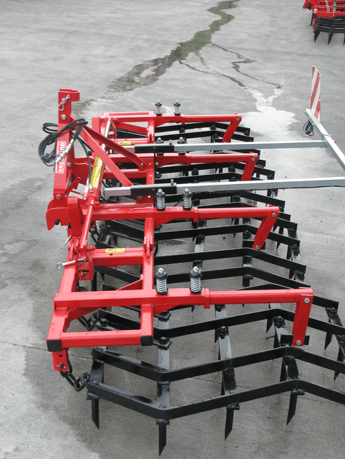 2 - Herse HVSL est un modèle lourd équipé de dents mangano-siliceux de 28 mm, longueur 280 mm qui conviennent aux sols les plus durs. Châssis bipoutre 100 x 100 jusqu’à 6,3 m et tripoutre à partir de 7,3 m.