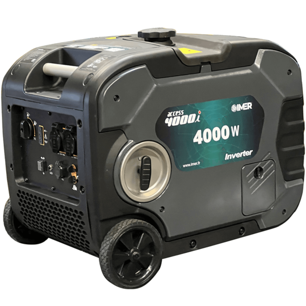 4T. Essence. Monophasé. INVERTER. Puissance maxi. 4 kW. 230V/50 Hz. Démarrage lanceur. Mise au ralenti automatique. Roues intégrées