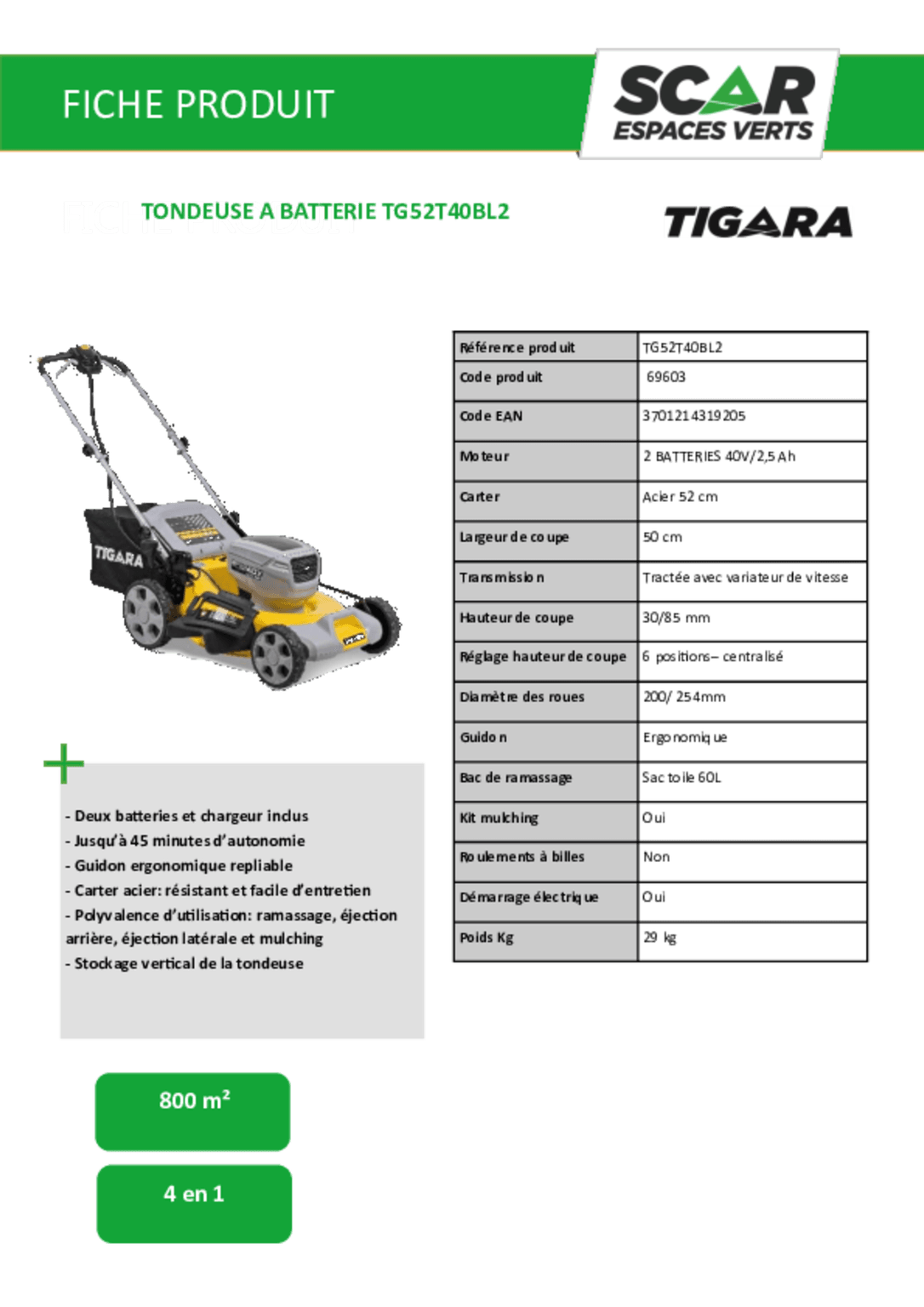 Moteur 1,2 kw. Autonomie moyenne : 80/100 min. Transmission électrique. Carter acier : 100 cm. Lame :...
