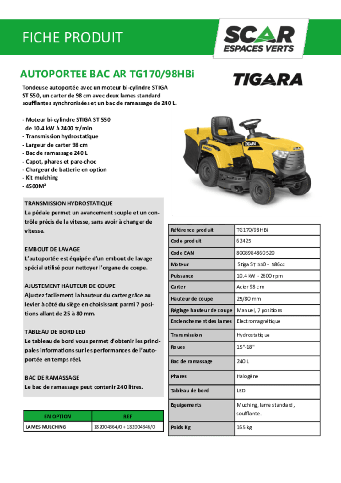 - Tondeuse autoportée à éjection arrière TG 170/98 HBI