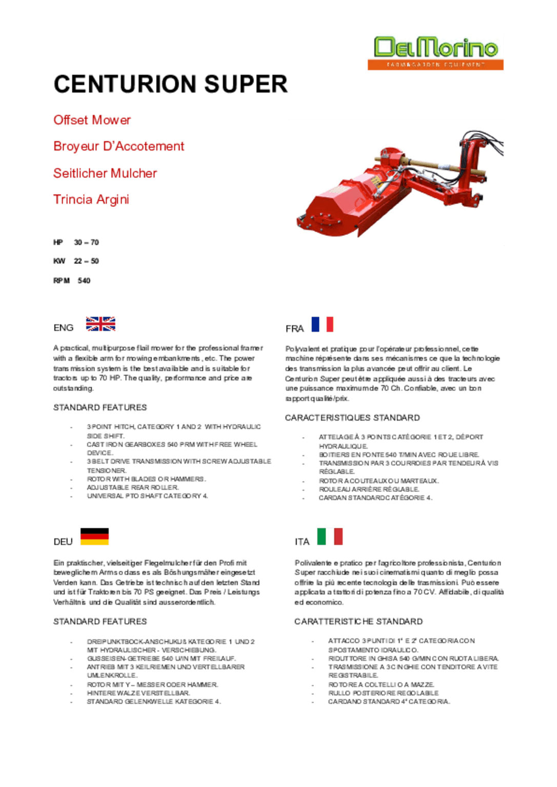 Equipement standard: Attelage à 3 points catégorie 1 et 2 - Boitier en fonte 540 tr/min avec roue libre.