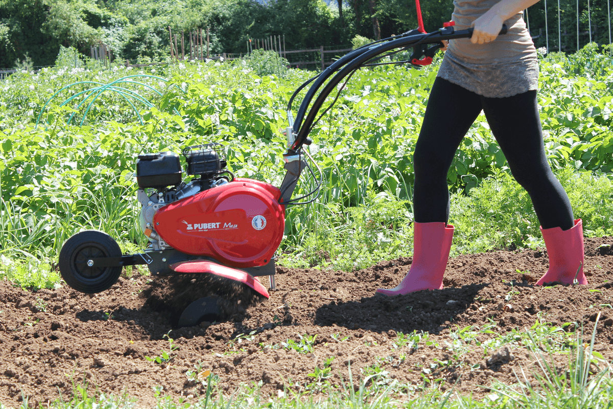 Moteur PUBERT R80. 79 cc. 1 vitesse AV et 1 AR. 4 fraises Ø 285 mm. Roue AV escamotable. Béquille de terrage.