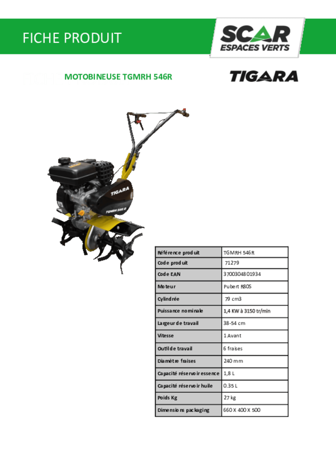 Moteur PUBERT R80. 79 cc. 1 vitesse AV et 1 AR. 4 fraises Ø 285 mm. Roue AV escamotable. Béquille de...