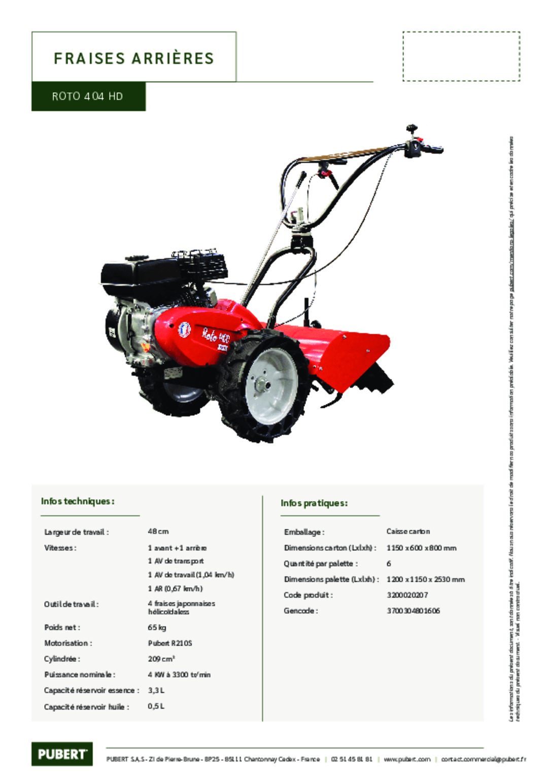 Moteur PUBERT R80. 79 cc. 1 vitesse AV et 1 AR. 4 fraises Ø 285 mm. Roue AV escamotable. Béquille de...