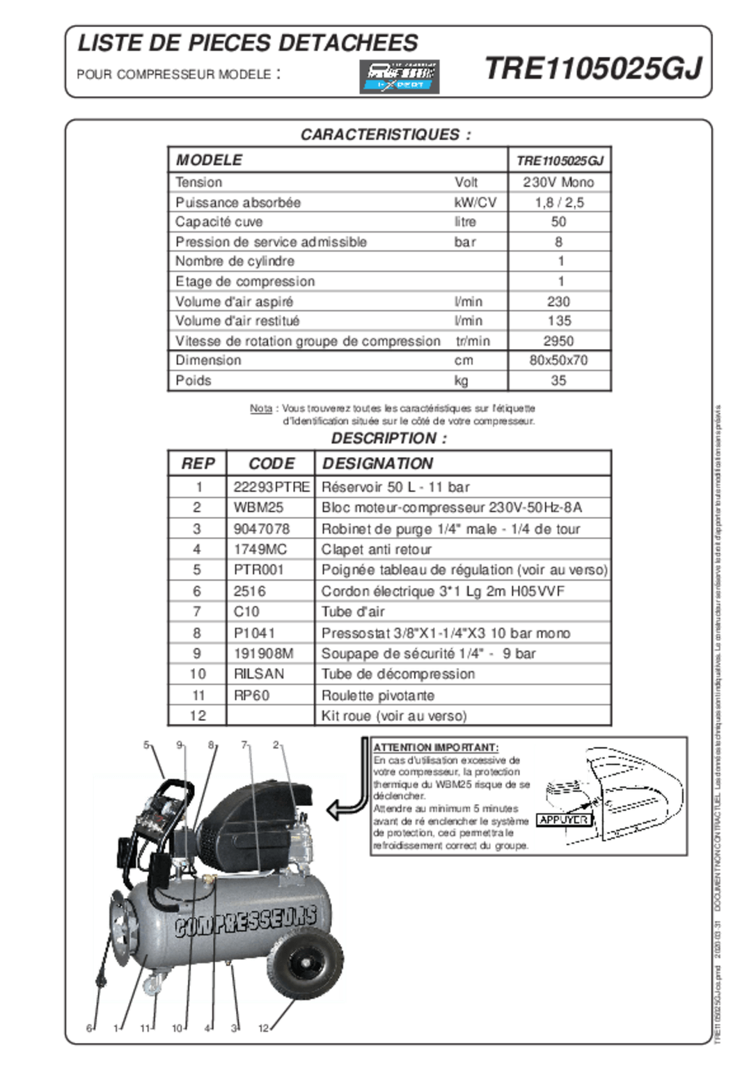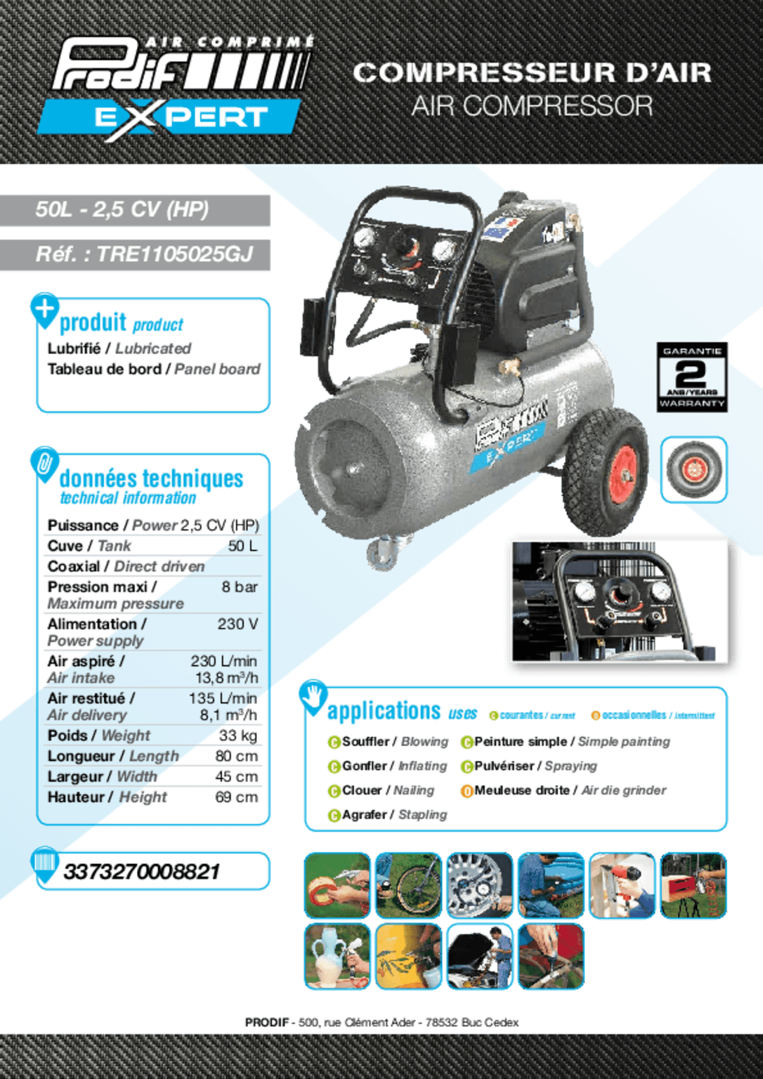 Débit aspiré : 230 L/min, débit restitué : 135 L/min, 8 Bar.