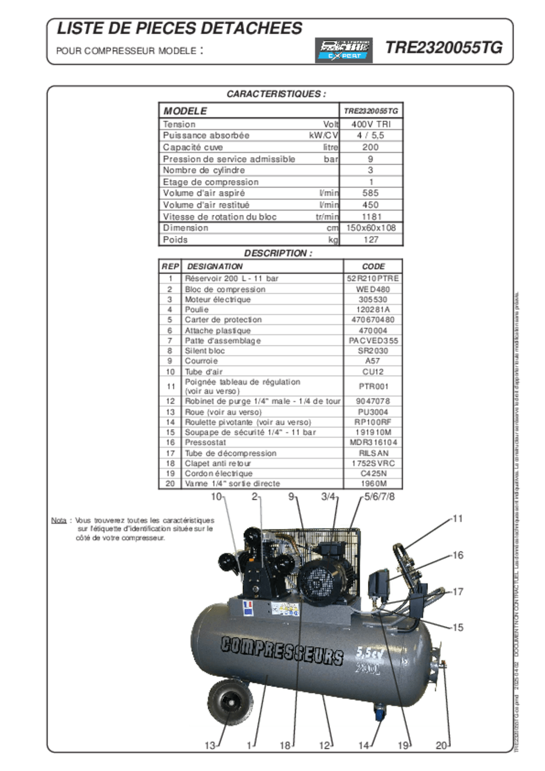 Débit aspiré : 585 L/min, débit restitué : 450 L/min, 9 Bar.