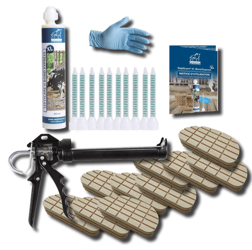 Cartouche de colle à 2 composants. Sèche en 3 secondes. Peut être remaniée pendant 15 secondes et adhère intensément en 30 secondes. Le KIT SEPTICARE XL contient : 1 cartouche de 250 ml, 1 pistolet d’application, 10 semelles en bois, 10 canules de mélange, 1 paire de gants.