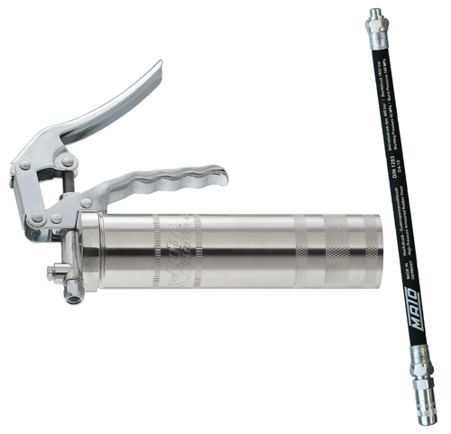 Pour cartouche à visser Lube-shuttle. Tête en acier galvanisé. Poignée ergonomique. Pression de service 400 Bar, haute pression jusqu’à 800 Bar. Flexible caoutchouc 2 tresses acier 300 mm, agrafe 4 mors.