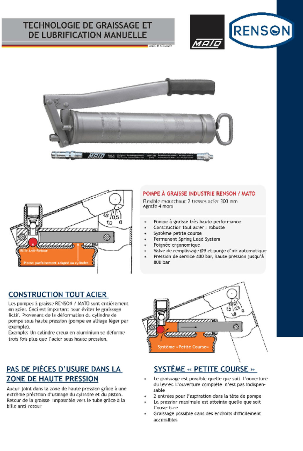 Pour cartouche 400 gr et graisse en vrac. Tête et corps de pompe en acier. Poignée ergonomique. Pression de service 400 Bar, haute pression jusqu’à 800 Bar. Flexible caoutchouc 2 tresses acier 300 mm, agrafe 4 mors. Valve de remplissage Ø 9 mm et purge d’air automatique.