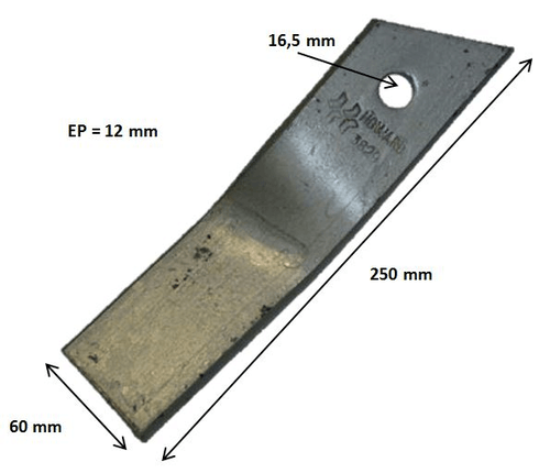 Hauteur : 250 mm. Largeur : 60 mm. Epaisseur : 12 mm. Diamètre trou : 16,5 mm. Référence boulon : 652968. Gauche.