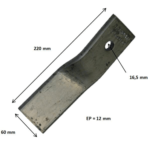 Lame P Equerre Origine. Hauteur : 175 mm. Largeur 1 : 80 mm, largeur 2 : 65 mm. Epaisseur : 5,5 mm. Entre-axe : 57 mm. Diamètre : 11,5 mm. Référence boulon : 650528. Gauche.